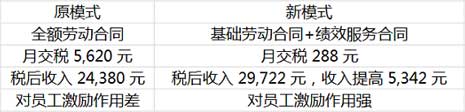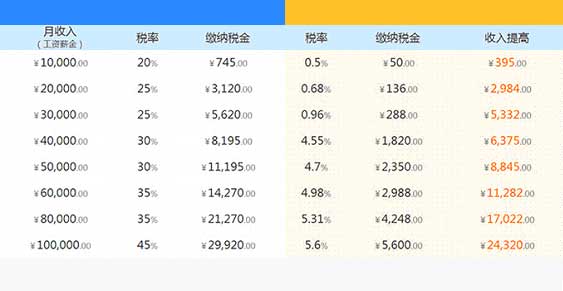 假设张小姐月收入3万,年收入36万,通过91税宝工资个税型产品,改变员工与公司之间的劳务关系,将原本的全额劳动合同关系,转变为基础劳动合同+服务合同。张小姐在改变合同模式后,把3万的收入分成两部分, 一部分每月按照劳动合同约定的基本工资5000元支付给张小姐;另一部分按照服务费形式支付给张小姐设立的个人独资企业。根据国家相关税收优惠政策,张小姐每月仅需要缴纳278元税金,净收入为29722元,相比此前的税后工资24380元,月收入瞬间提高了5342元,综合税率仅0.96%,收入越高对比效果越明显!